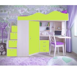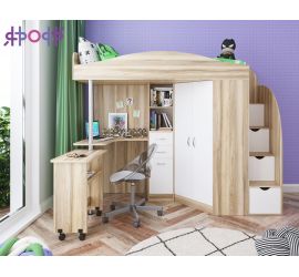 Второй вид кроватей-чердаков рассчитан на возраст детей от пяти лет. Спальное место в таком случае располагается на высоте 1,3-1,6 метра. На первом ярусе чаще всего есть шкаф и рабочая зона в формате письменного стола и книжных полок.